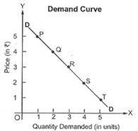 The above curve shows the quantity demanded on OX axis and Price of the commodity on OY axis. DD is the downward sloping curve showing the negative relationship between price and quantity demanded. When the price is ₹1, the consumer makes purchase of 5 units. When price rises to ₹5, the quantity demanded decreases to 1 unit.